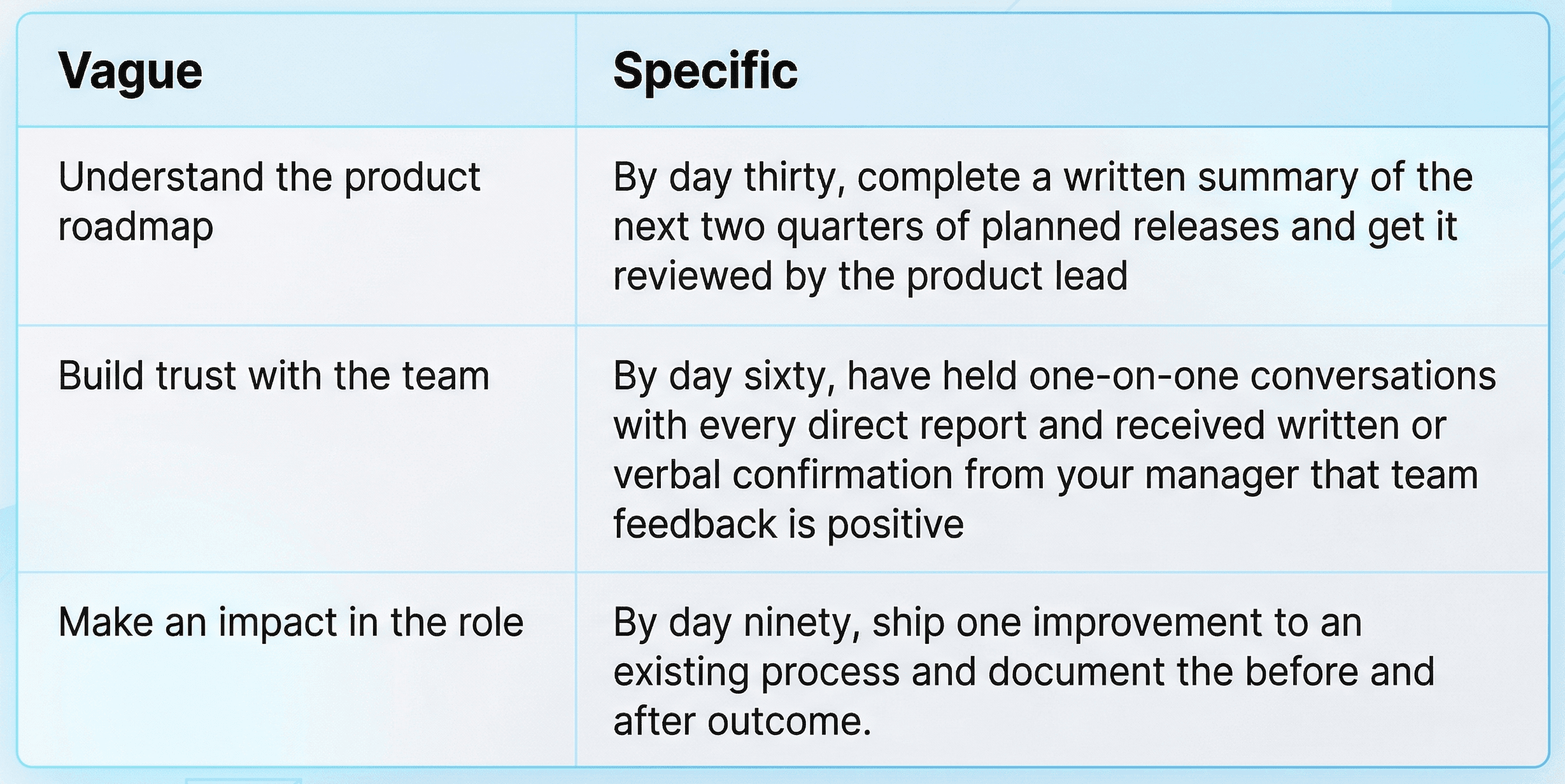 For each phase of your 30 60 90 review template, define one to three observable, time-bound metrics per objective. The test for a good metric is simple: could two different people look at the same evidence and agree on whether it was met?
