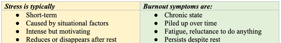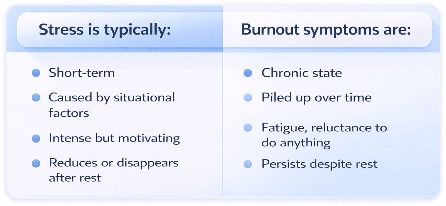 Stress and burnout are related, but there are still important differences to be aware of. Stress is usually short-term and situation-based. Burnout, on the other hand, is a long-term state of depletion. When you understand the difference, you’ll be able to come up with proper recovery strategies.