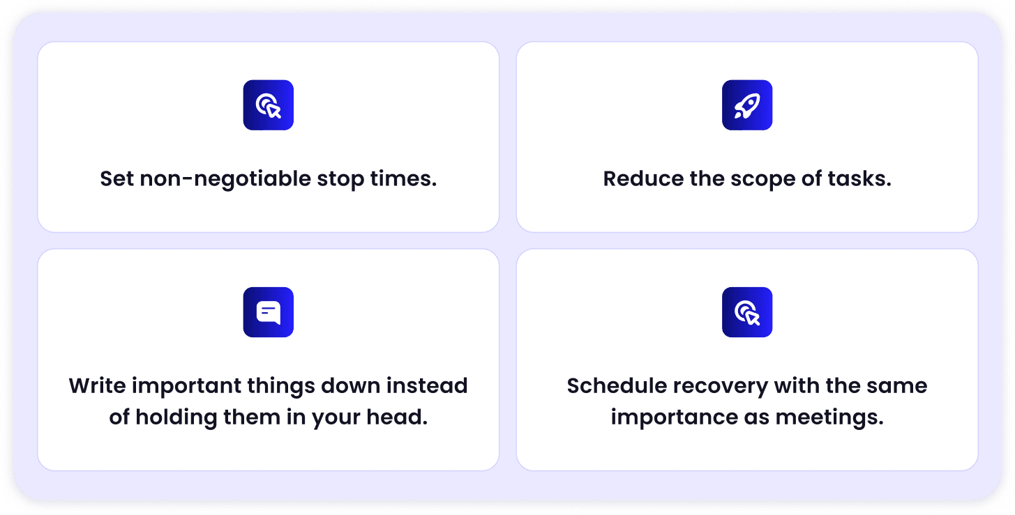 For many people, taking extended time off simply isn’t possible. That doesn’t mean recovery has to wait. When recovering from burnout while still working, you need to focus on protecting energy, not maximizing productivity.