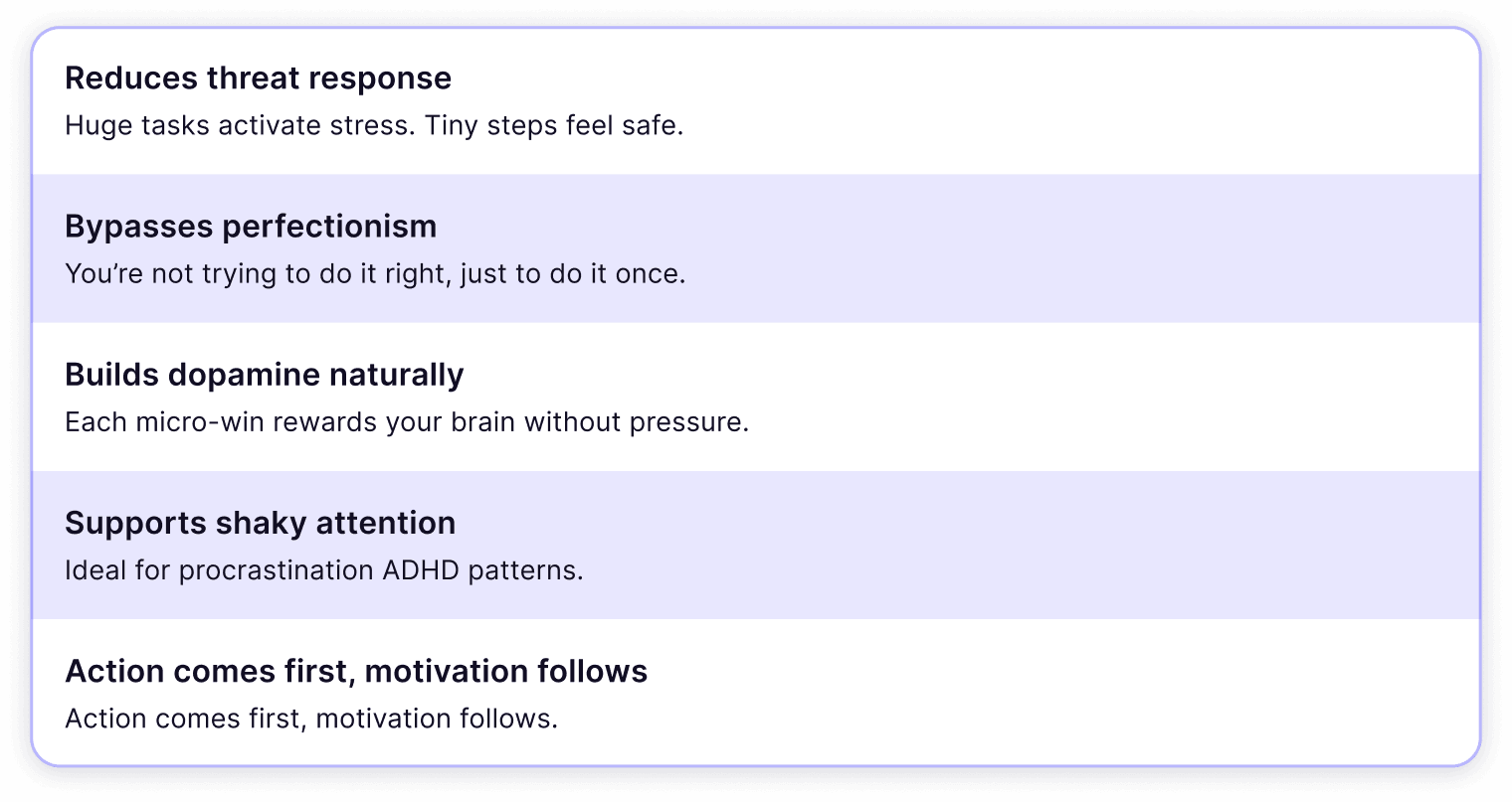This approach works because it bypasses the question of whether ADHD causes procrastination. Instead of asking your brain to fight resistance, you’re removing resistance at the source.